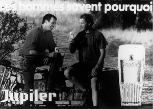 L'amateur de bière devrait comprendre que Jupiler est une pils de haute qualité qui se boit a toute occasion. La proposition: "Jupiler is the man's ideal pils for great pleasure and taste satisfaction at any occasion".
