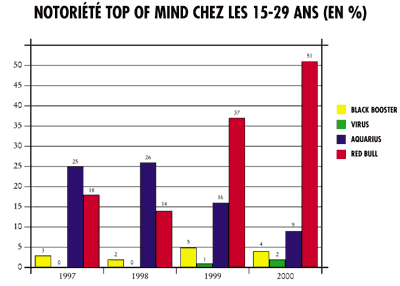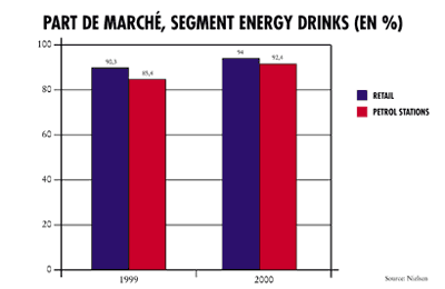 Le nombre d’unités vendues (canettes de 25cl) et le bénéfice ont atteint des sommets, dépassant les espoirs les plus fous. 87% d’augmentation des ventes en 98, 71% de plus en 99 et 47% de plus en 00. Avec pas moins de 25 mio de canettes vendues en 2000 en Belgique, Red Bull est devenu un joueur important, non seulement dans le marché des energy drinks, mais également dans le marché des soft drinks en général.