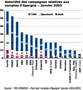 b. En termes de notoriété aidée des campagnes relatives aux comptes d'épargne, le Compte FIRST s'impose en tête du peloton, devant des forteresses bancaires telles que Fortis, Dexia ou Axa.