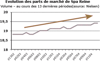 Dans une période au cours de laquelle les principaux concurrents se voyaient obligés de maintenir leur position au moyen de promotions, Spa Reine a réussi à augmenter sa part de marché de manière significative en ramenant sa proportion du volume réalisée en vente promotionnelle(promo share) de pas moins de 7%.