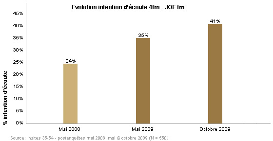 L'objectif principal d'une chaîne radiophonique est de gagner des parts de marché. Pour JOE fm, cela doit se faire au niveau du groupe-cible 30-49 intéressant sur le plan commercial. On voulait évoluer d'une part de marché de 7,6% pour 4fm sur le groupe-cible à une part de marché de 10% en 201.