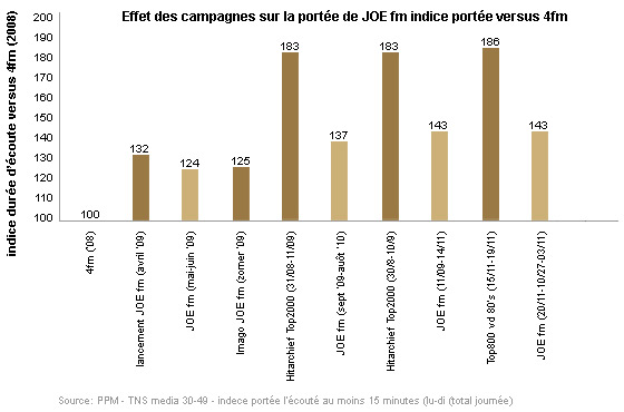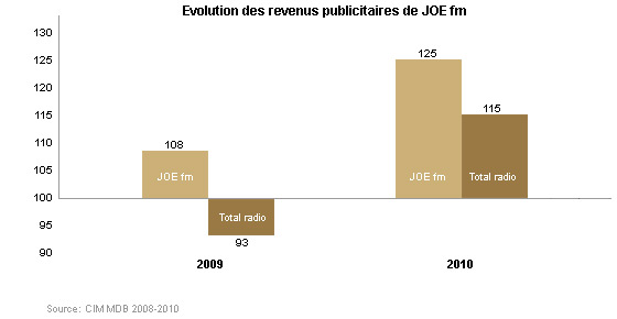 Au cours de l'année de crise 2009, les revenus publicitaires de JOE fm ont progressé de 8% en comparaison à un recul de 7% du marché. En 2010, nous avons même progressé de 25%, contre 15% pour l'ensemble du marché.