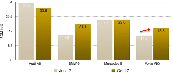 Le handicap en termes d'image de marque de Volvo par rapport aux concurrents signifie que les gens ne pouvaient apprécier ce nouveau modèle qu'en l'expérimentant physiquement. Volvo en tant que marque et la Volvo V90 en tant que nouveau modèle ont un retard conséquent face à la concurrence au niveau de la notoriété et de l'opinion. L'approche classique où l'on travaille d'abord la notoriété de marque et l'opinion pour ensuite conduire vers la considération prend du temps. Si nous voulons obtenir des résultats plus rapidement, alors nous devons travailler plus directement et plus activement la considération, ceci grâce à la découverte concrète de la voiture. L'expérience de la voiture est donc cruciale.