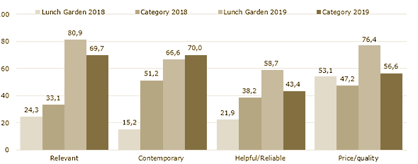 La perception de modernité de la catégorie a augmenté par rapport à l'année précédente. Malgré une progression de plus de 45 %, nous n'avons pas atteint la moyenne de la catégorie. Pourtant, la croissance de Lunch Garden pour ce paramètre (+51,4 %) a largement dépassé la croissance de la catégorie (+18,8 %).