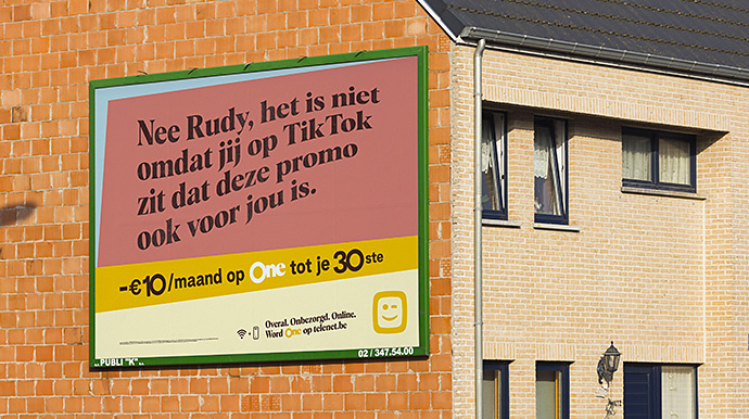 Pour montrer qu'il ne s'agissait pas d'une promesse en l'air, nous avons choisi des médias pour public jeune mais aussi plus large. Nous avons couvert les murs et les écrans avec des messages impossible à rater. Les petits caractères, que personne ne lit, étaient remplacés par des mots comme « algue », « roquette » ou même « étui pénien ». Sur Facebook, nous posions clairement la question de savoir s'il y avait des personnes de moins de 30 ans qui traînaient dans le coin. Même dans les trams, notre message était clair : ONE a la promo pour tous ceux qui ne sont pas encore dans la trentaine.