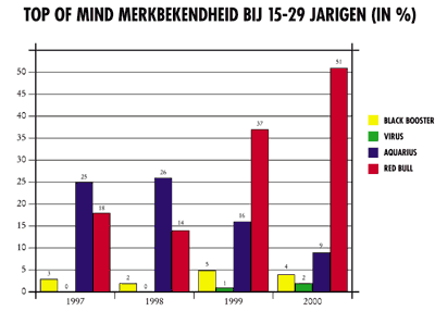 De resultaten qua naambekendheid bij de kerndoelgroep van 15-29 jarigen tonen dezelfde steile opmars en dominantie van Red Bull aan (Bron: De Compagnie). Tussen ’97 en ’00 steeg de TOM met 300% en de spontane naambekendheid met 200%.