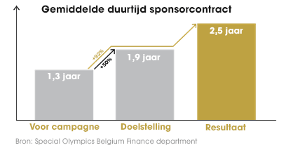 3. RESULTATENNiet minder dan 34 bedrijven (42% boven doelstelling) tonen interesse om over sponsormogelijkheden rond de tafel te zitten. De leads zijn van hoog niveau. Want ongeveer 1 op de 2 meetings leidt tot een nieuw contract. We willen 12 nieuwe sponsorcontracten bereiken. Het worden er uiteindelijk 16. Dit is 33,3% boven de doelstelling. We willen graag grote namen als sponsor. Hun imago straalt immers af op Special Olympics Belgium. Een grote naam is een bedrijf of merk dat al investeert in marketing in een B2C-context. In 2017 vallen 58% van de Special Olympics-sponsors daaronder. Met namen als Coca-Cola (Aquarius), Telenet, Procter&Gamble, Lotto, Belfius, Johnson&Johnson, Nestlé, Toyota, Axa, Red Bull, UPS, Harley Davidson, Devos&Lemmens en McCains halen we ook die doelstelling. Grote namen vormen nu 79% van de Special Olympics-sponsors. Special Olympics heeft nood aan langdurige contracten om zijn missie waar te maken. De 16 nieuwe contracten hebben een gemiddelde looptijd van 2,5 jaar. Dat is 92% langer dan de oude contracten. Met dat resultaat zitten we boven ons doel van 50% langer. |