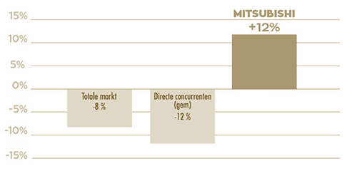 Gezien de moeilijke context, zetten we de doelstelling van de campagne voorzichtig op een stijging van +5% in verkoop ten opzichte van het jaar voordien. De resultaten lagen ver boven verwachtingen: Mitsubishi Motors verkocht met minder middelen 11,72% meer wagens. En dit terwijl de totale autoverkoop in diezelfde periode daalde met 8,14%. De gemiddelde verkoop bij onze directe concurrenten daalde zelfs met 12,22%.