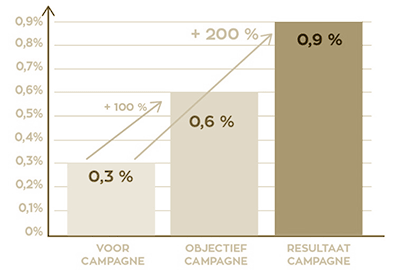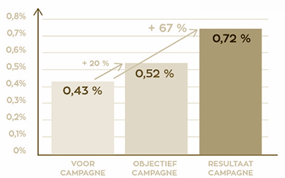 Daarnaast was de doelstelling de jarenlange dalende trend stopzetten en opnieuw stijgen in marktaandeel: van 0,43% naar 0,52%. We overtroffen dat resultaat want op het einde van onze campagne (eind februari) mochten we afkloppen op een marktaandeel van 0,72%. Dit is een stijging van maar liefst 67%.