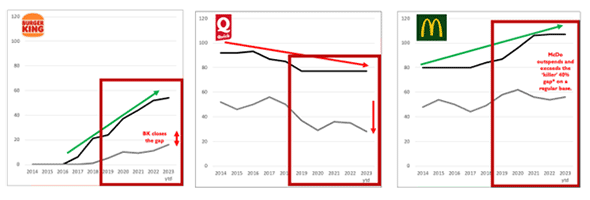 Sinds 2015 en met een versnelling tussen 2019 en 2023 werd Quick in de verdrukking gebracht door de internationale spelers en verloor het in totaal 21% zichtbaarheid op straat en 24% zichtbaarheid in de media (vs 2015).
