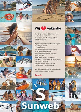 As a market challenger, Sunweb operates with a digital-first business model and blends best of both worlds between 'classic tour operators' and 'online travel agencies'. Operating without bricks-and-mortar sales outlets however has the consequence that Sunweb is physically less visible. Hence a brand like Sunweb understands the need to establish a deeper connection with the customer, instead of building on short-term USP's that are easy to copy.